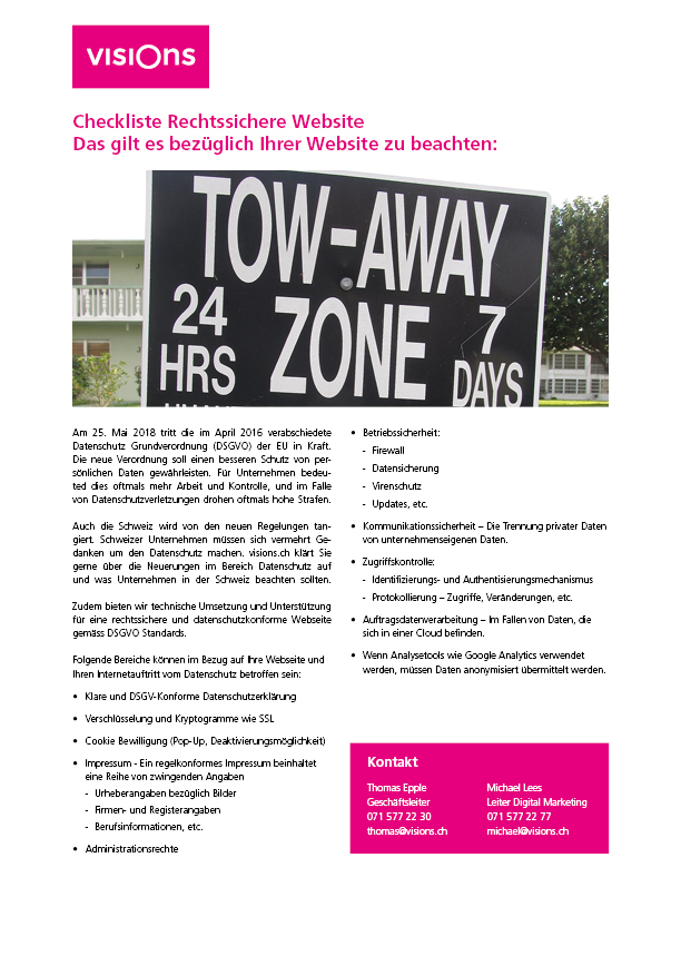 Bei Bedarf kann Ihnen visions.ch auch einen kompetenten Datenschutzbeauftragten für Ihre Firma empfehlen.