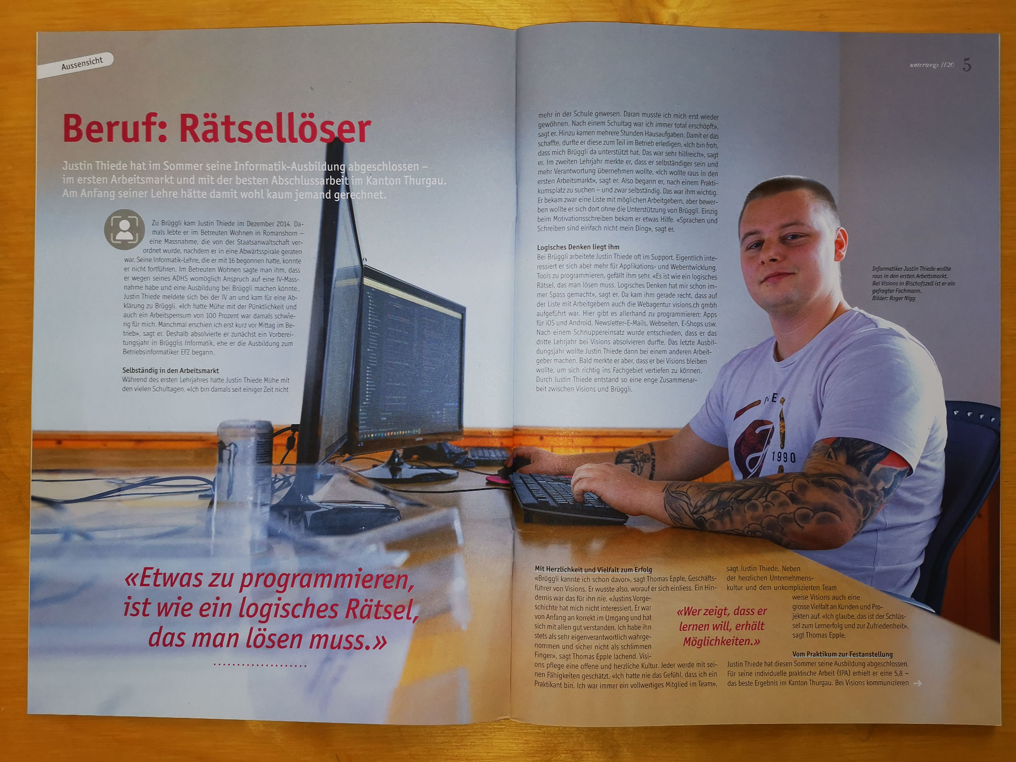 Dies war der Grund, dass ihm dass halbjährlich erscheinende Magazin "unterwegs" des Brüggli, Romanshorn einen Artikel widmete. Wir gratulieren an dieser Stelle nochmals zum hervorragenden Lehrabschluss!