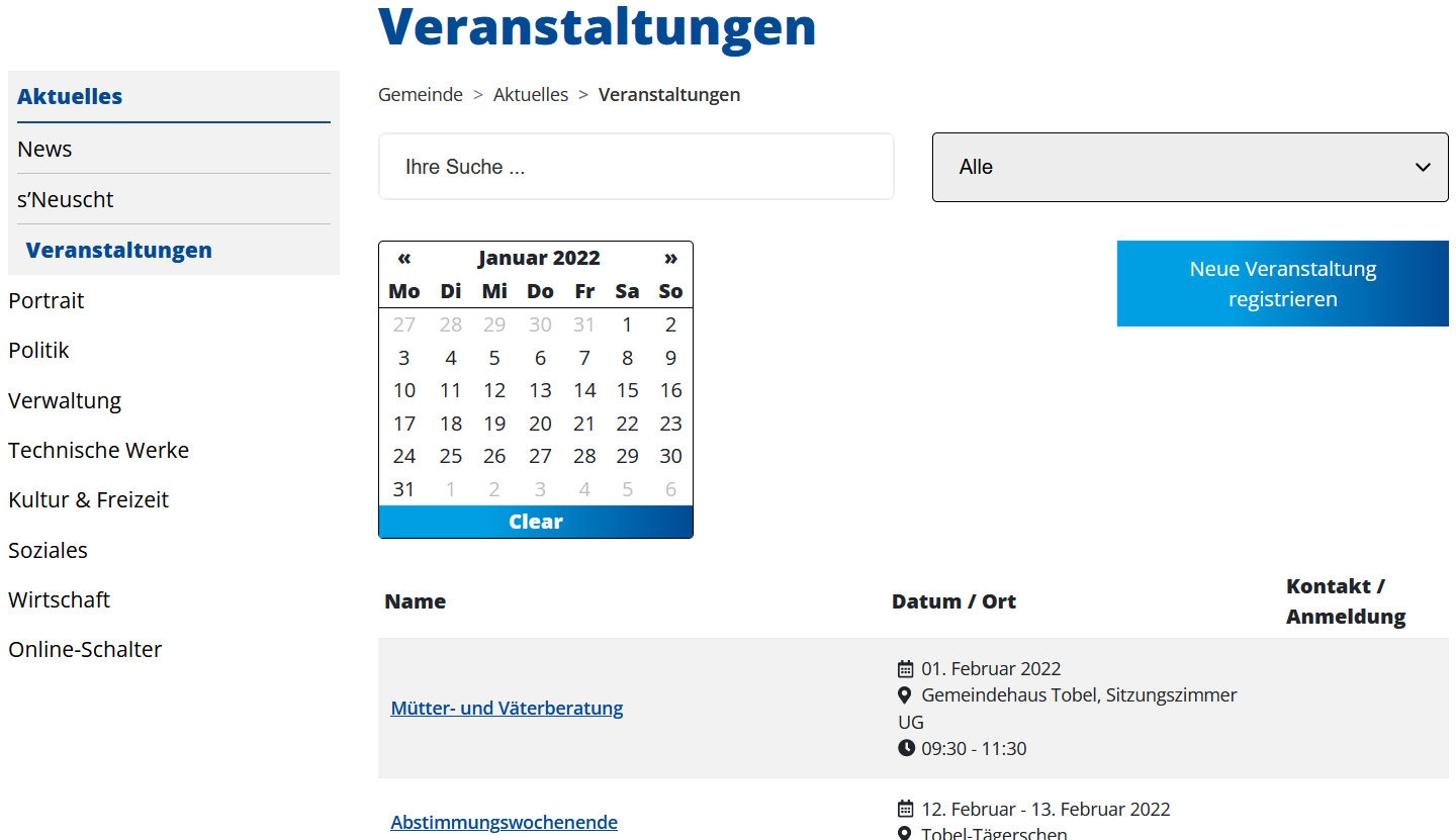 Der Veranstaltungskalender kann nach Datum, Kategorie oder mit einer Textsuche abgerufen werden. Die aktuellsten Veranstaltungen werden auch auf der Startseite angezeigt. Jede Veranstaltung kann mit Fotos, Links oder PDF’s angereichert werden.